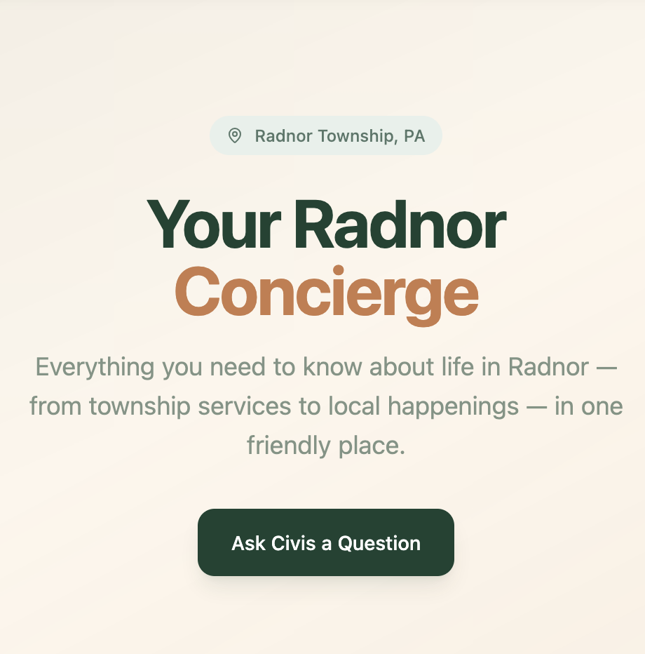 Residents are overwhelmed by fragmented local information spread across township pages, PDFs, social posts, and outdated links. Simple questions—“When is trash pickup?” “Is there a snow emergency?” “What’s happening this weekend?”—require time, guesswork, and cross-checking multiple sources. Civis solves this by acting as an agentic town layer: it understands your location, pulls from verified civic and cultural sources, and delivers clear, contextual answers instantly—no navigation required.